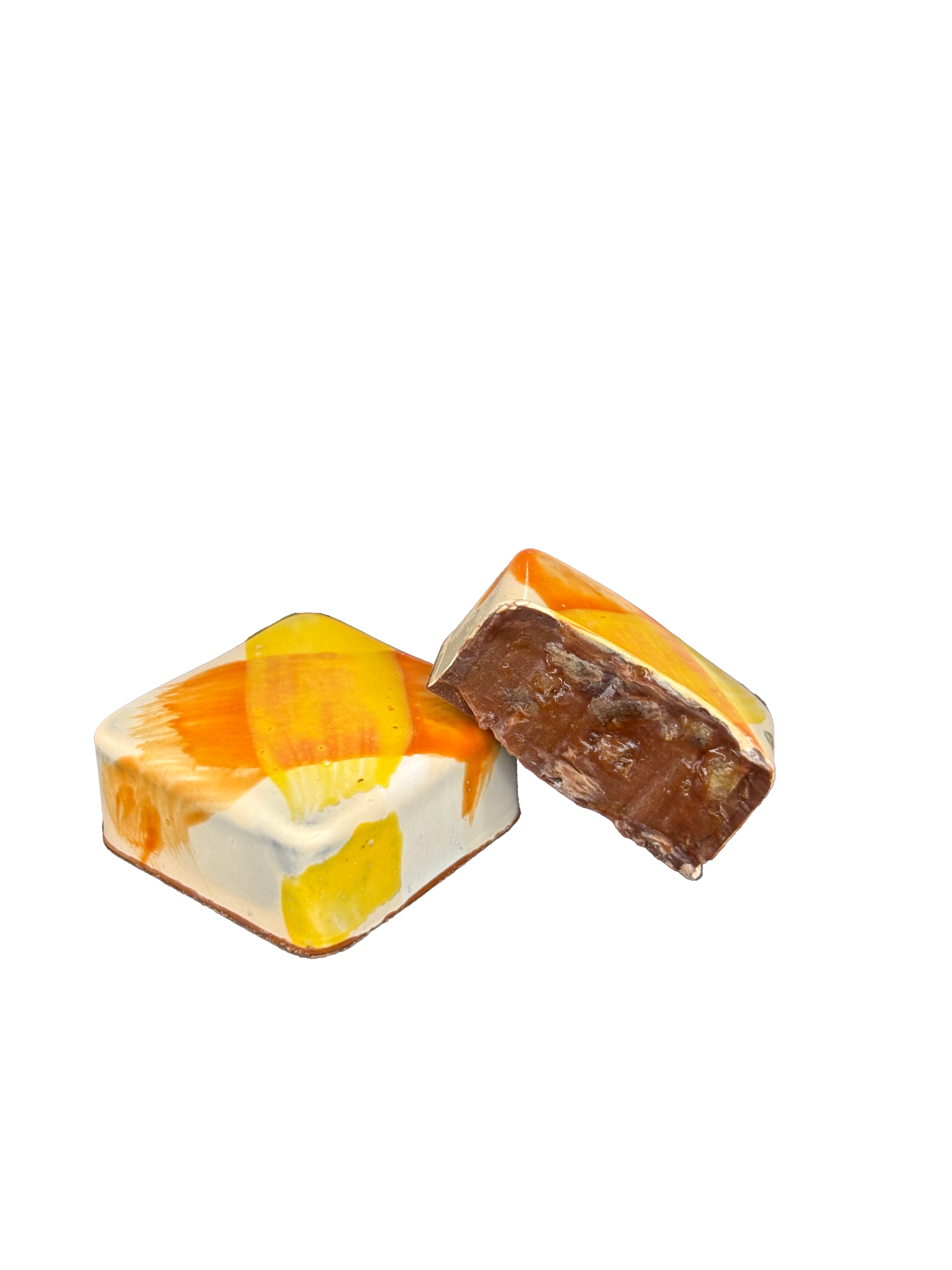 Cobertura de chocolate oscuro 62% peruano que envuelve una ganache de leche 40% ecuatoriana, mezclada con jugo de naranja natural y trozos de naranja confitada. Un bombón fresco, cremoso y cítrico, con el equilibrio perfecto entre dulzura y acidez.